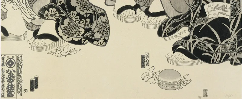 "McDonald's Hamburgers Invading Japan -Takageta y papas fritas ". Xilografía, aguafuerte, aguatinta-1982.
